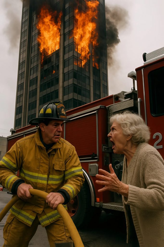 Hän juoksi suoraan palomiehen luo, joka piti letkua käsissään, ja alkoi sadatella, huomaamatta vaaraa ympärillään. Hänen silmissään oli pelkoa ja vihaa — ehkä joku läheinen oli jäänyt sisään.