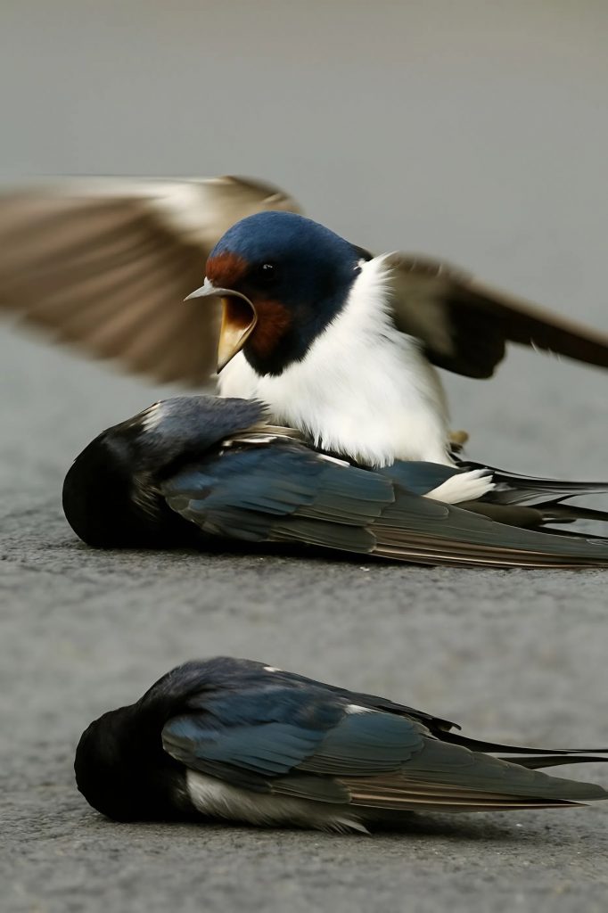 Kun pieni lintu makasi liikkumattomana maassa, sen kumppani syöksyi välittömästi alas sen luo, välittämättä ohikiitävien autojen vaarasta. Se laskeutui aivan sen viereen ja päästi ilmoille teräviä, tuskaisia ääniä – aivan kuin olisi yrittänyt herättää sen, tuoda sen takaisin eloon.