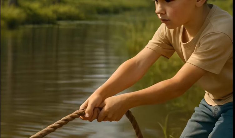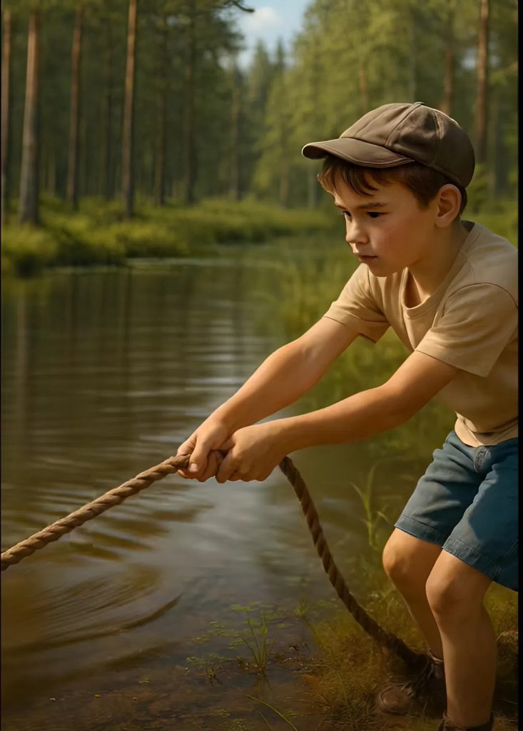 Poika pudotti köyden, horjahti ja kaatui hiekalle. Köysi liukui hitaasti takaisin veteen ja katosi.