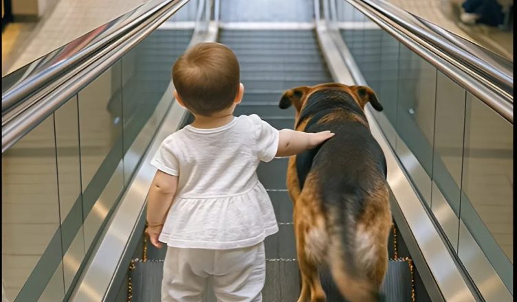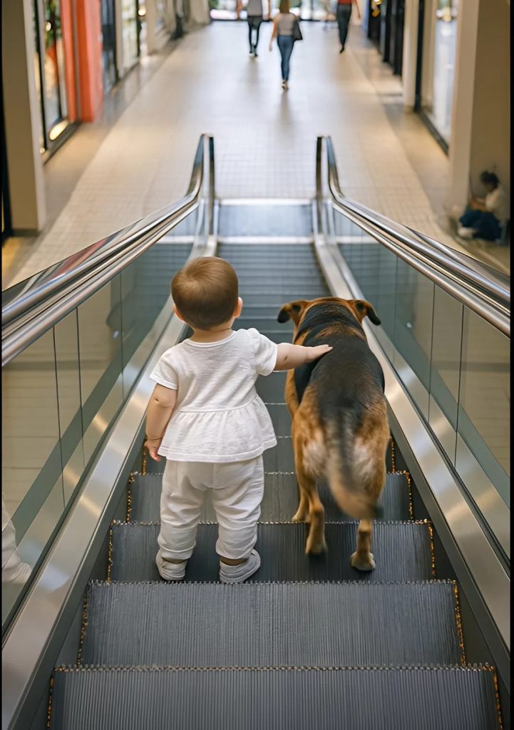 Liukuportaissa edessäni seisoi pieni tyttö – tuskin puolitoistavuotias, pukeutuneena valkoiseen puseroon ja vaaleisiin housuihin. Hänen vierellään seisoi suuri koira, todennäköisesti saksanpaimenkoira.