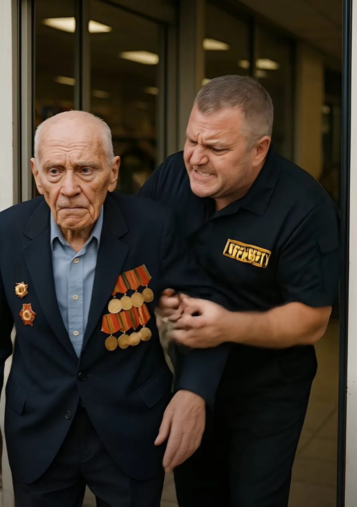 Vartija, kookas viisikymppinen mies, tuli paikalle. Hän tarttui vanhusta käsivarresta ja alkoi työntää häntä ulos.