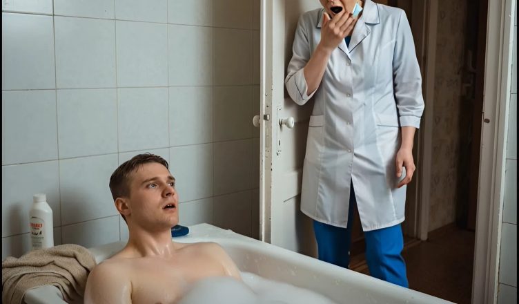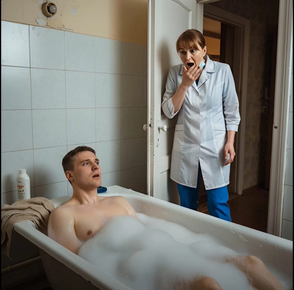Hoitaja auttoi toisen työntekijän kanssa kantamaan hänet kylpyhuoneeseen. Hän täytti ammeen lämpimällä vedellä, lisäsi hieman vaahtoa ja alkoi varovasti pestä miehen vartaloa.