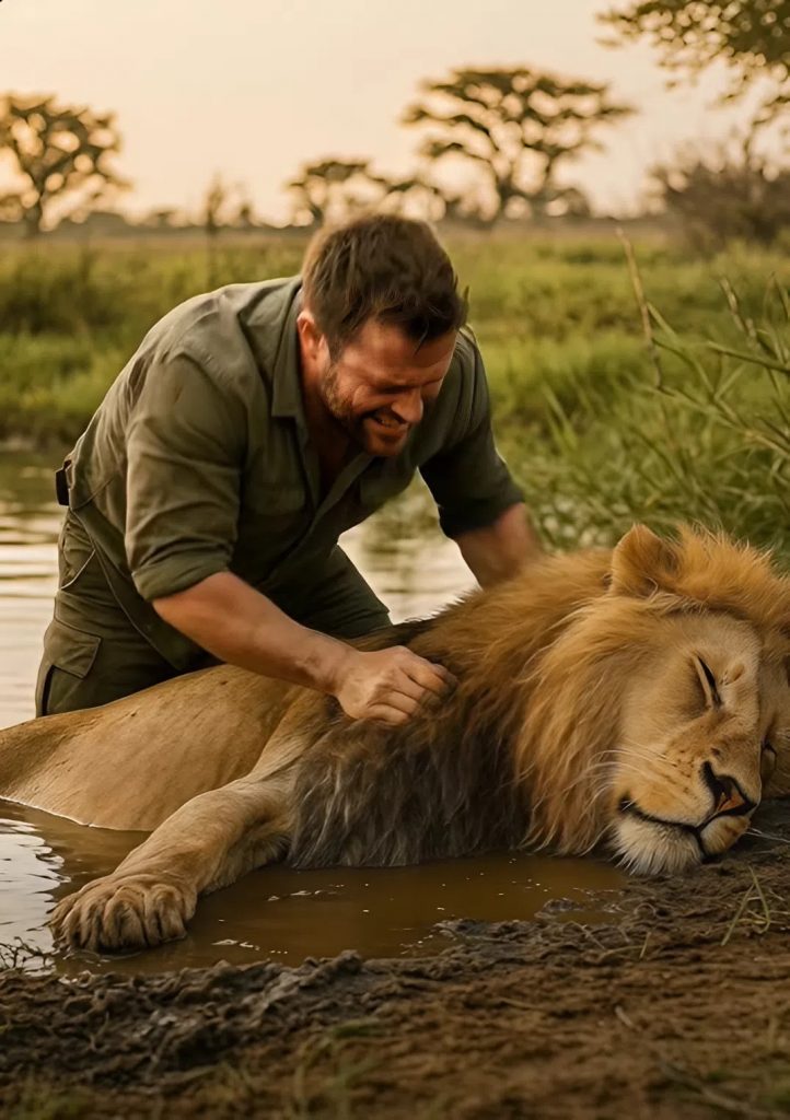 Eläinten kuningas, savannin mahtava hallitsija, taisteli elämästään virrassa. Leijonat osaavat uida, mutta tämä yksilö oli haavoittunut, uupunut ja uppoamassa. Mies ei epäröinyt hetkeäkään. Hän heitti repun ja kameran pois ja sukelsi jäiseen veteen.