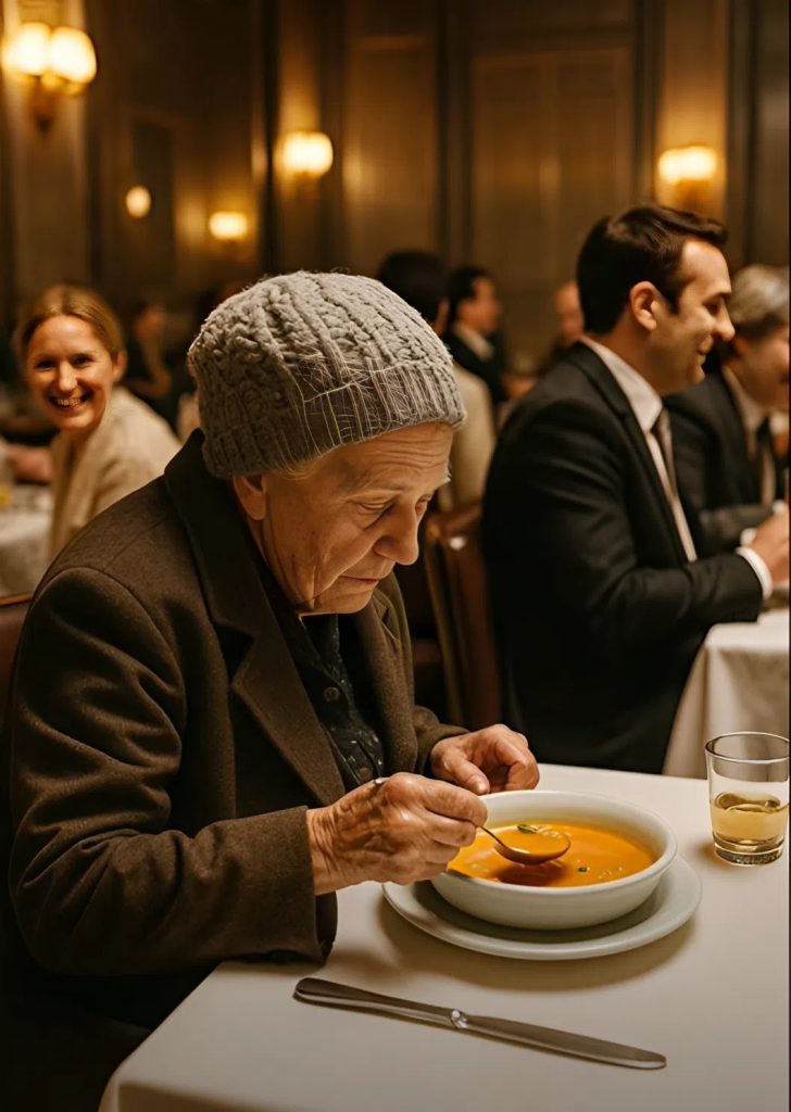 Virkailija huokaisi ja johdatti hänet vastahakoisesti salin nurkkaan, kauas muista asiakkaista. Valkoiset pöytäliinat, kristallilasit ja hiljainen taustamusiikki loivat tunnelman, jossa vanhan naisen olemus näytti monen mielestä “sopimattomalta”.