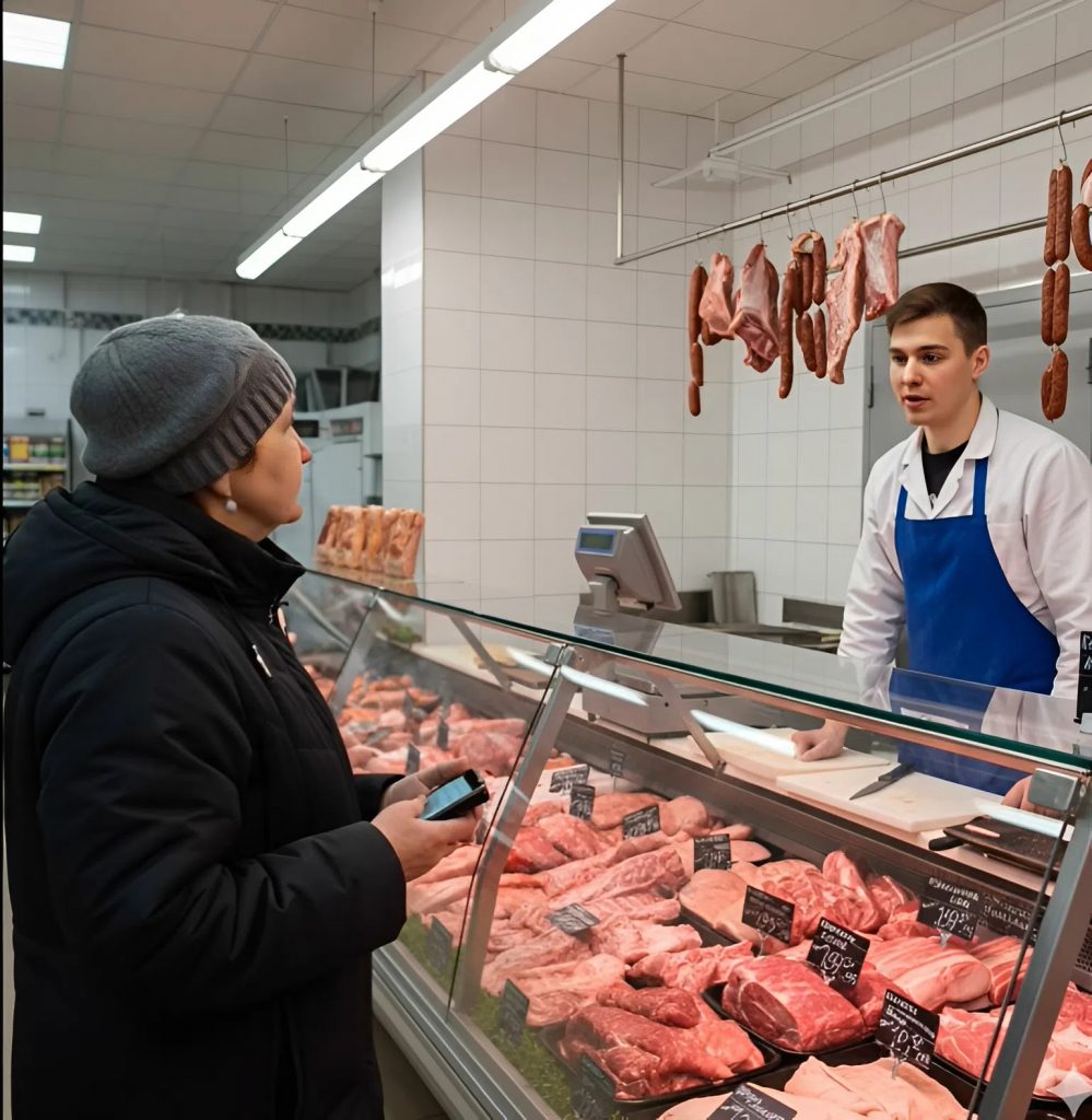 — Tavalliseen tapaan, neljäkymmentä kiloa naudanlihaa, — hän kuiskasi ja ojensi huolellisesti taitellut setelit.