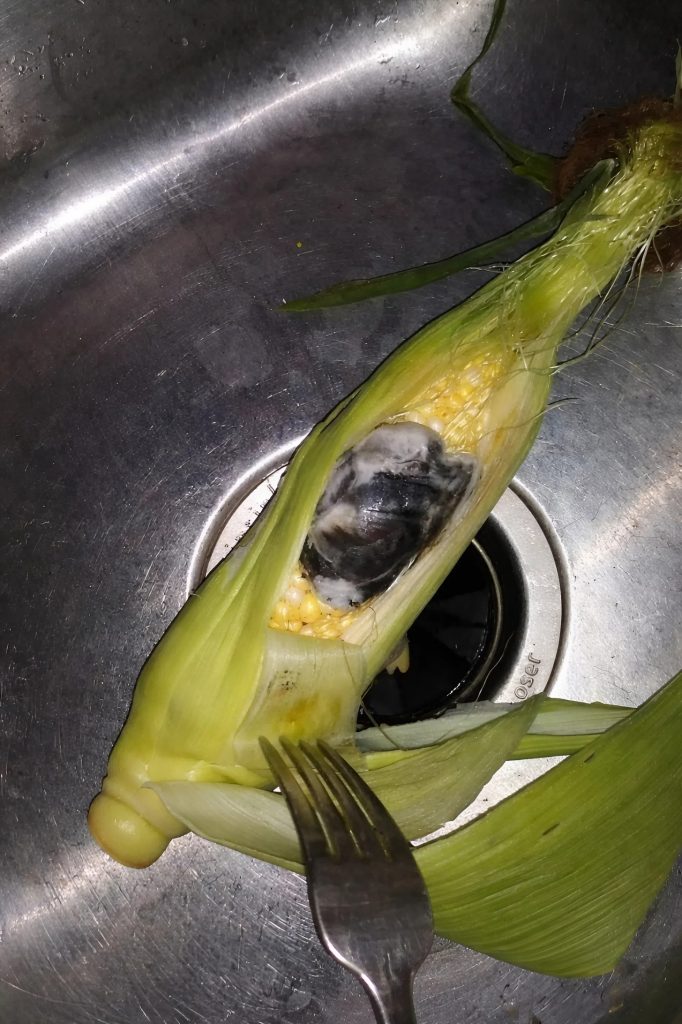 Tunsin epämääräistä inhoa ja samalla levottomuutta. En uskaltanut koskea siihen sormilla. Asetin maissin syrjään ja tarkistin seuraavan. Löysin samanlaista massaa vielä kahdesta tähkästä. Sillä hetkellä päätös syntyi silmänräpäyksessä: heitin koko pussillisen roskiin. Ei mitään ”ehkä tämän voi puhdistaa” tai ”jospa vain osa on huonoa”. Ei. En ajatellut riskeerata, varsinkaan kun kyse oli lapsista.