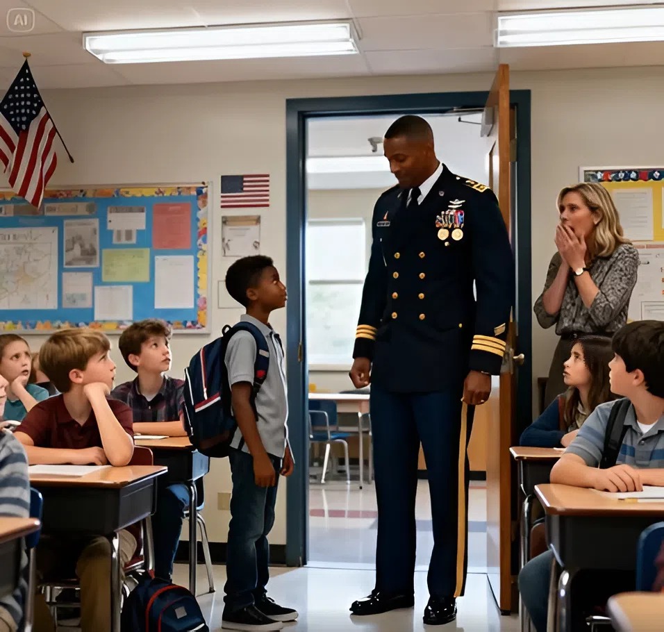 Oviaukossa seisoi pitkä mies täydellisesti silitetyssä sotilaspuvussa. Käytävältä tuleva valo kehysti hänen hahmonsa kuin elokuvakohtauksessa. Hänen rinnassaan kiilsi tunnusmerkki, ja hänen katseensa oli rauhallinen, varma ja arvokas.