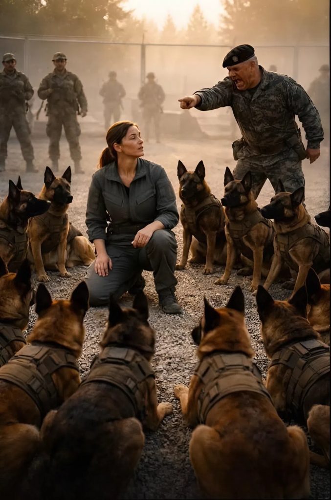 Yksi kouluttajista astui varovasti askeleen eteenpäin, katse tiukasti koirissa, jotka seisoivat naisen ympärillä. Hänen huulensa värähtivät, kuin hän olisi halunnut sanoa jotain… mutta sanat eivät tulleet.