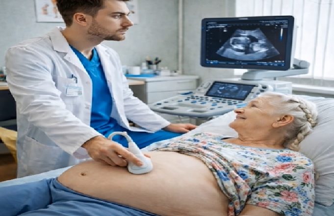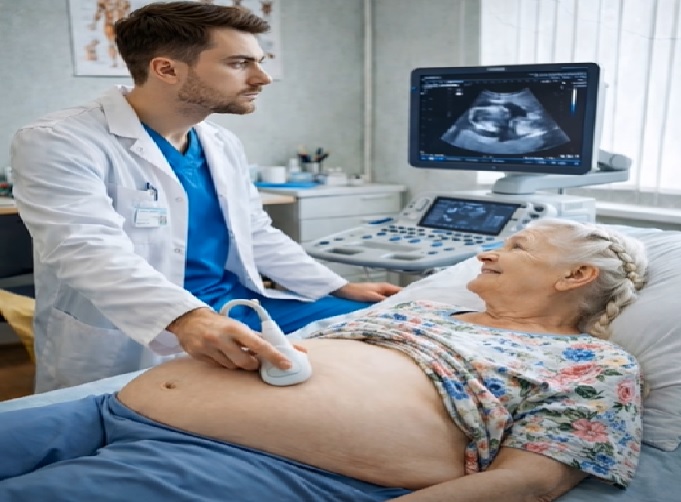 Lääkäri käänsi näytön hänen suuntaansa. Kuvasta näkyi selvästi suuri muodostuma vatsaontelossa.
